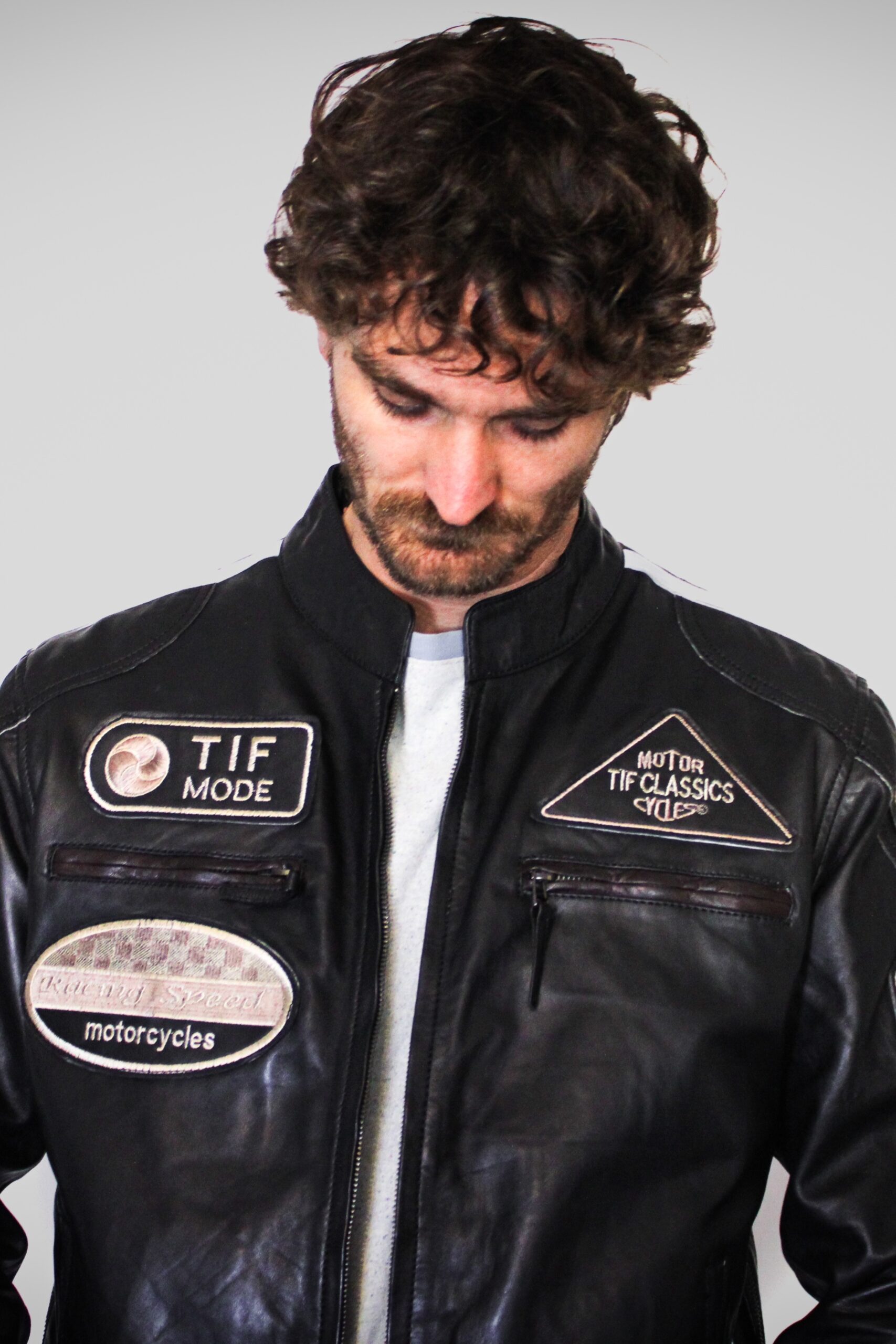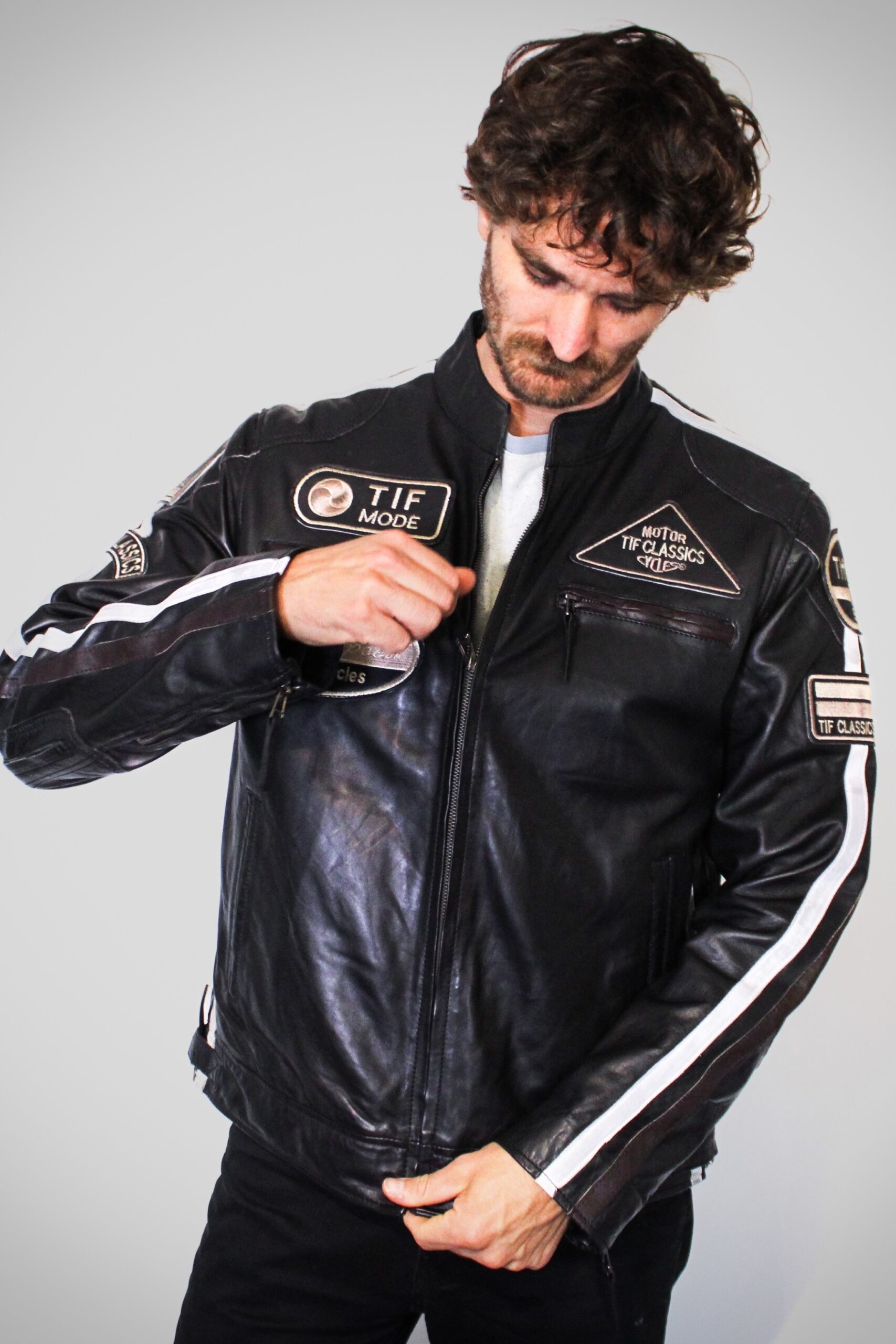 O Blusão em Pele Black Motorbiker traz a essência das motos clássicas para um design atual, robusto e cheio de identidade. Em couro 100% premium, este modelo destaca-se pelas faixas brancas nas mangas e pelos patches exclusivos, criando um visual autêntico inspirado no universo motard, perfeito para quem gosta de peças com caráter forte e presença imediata.