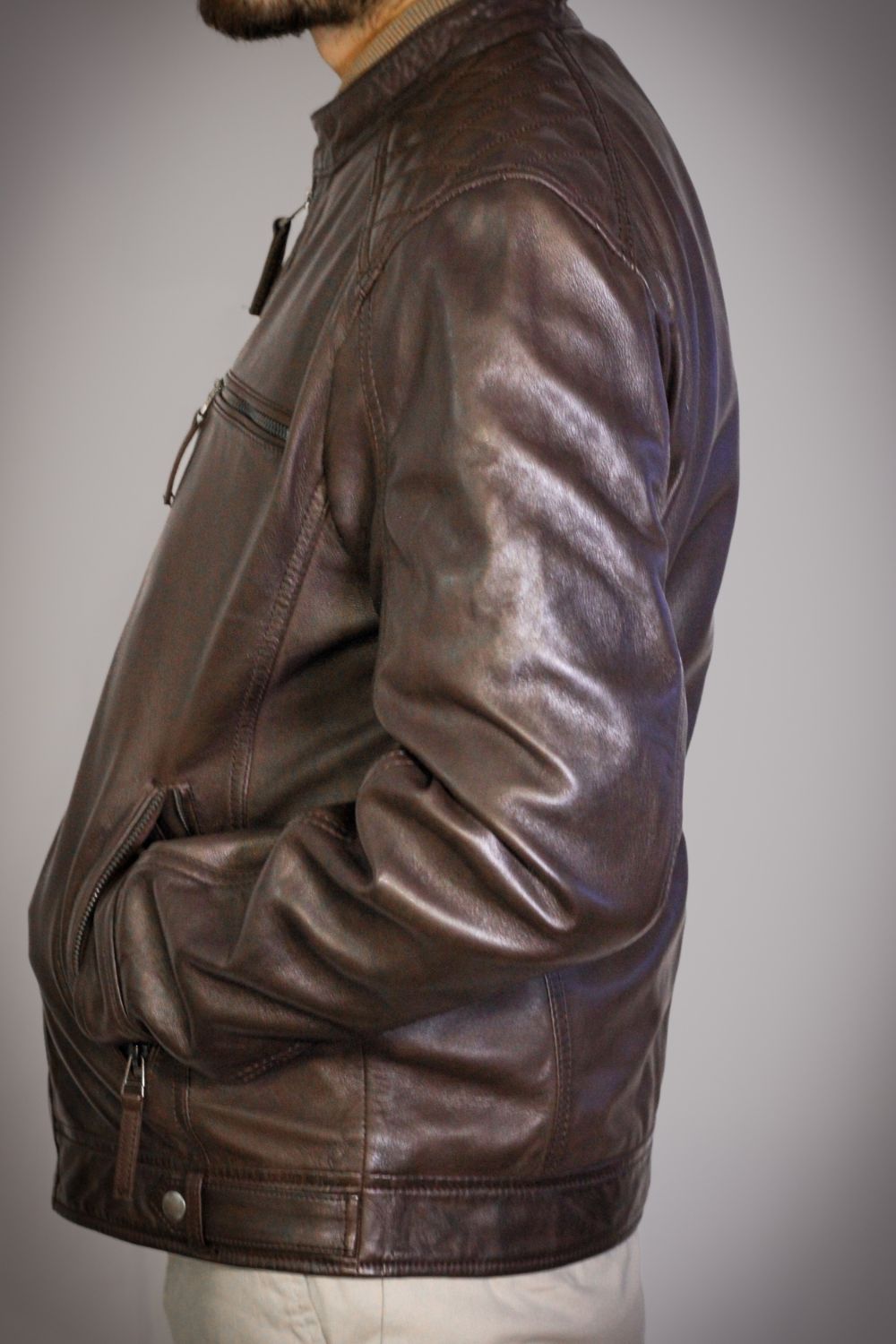• Acabamento Artesanal: A variação de tons no couro realça a autenticidade da peça e torna cada blusão visualmente único — sem padrões artificiais, sem repetição.