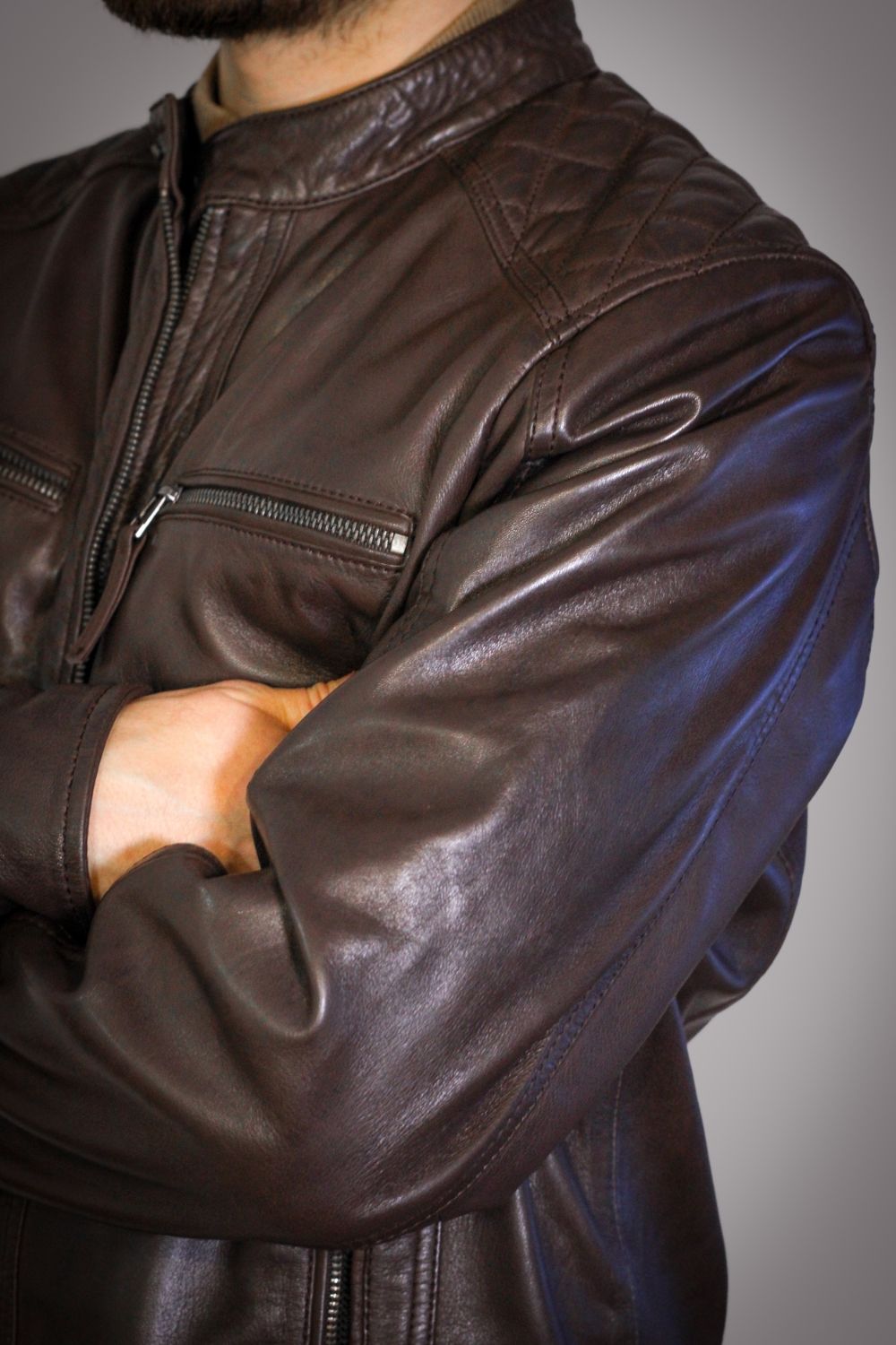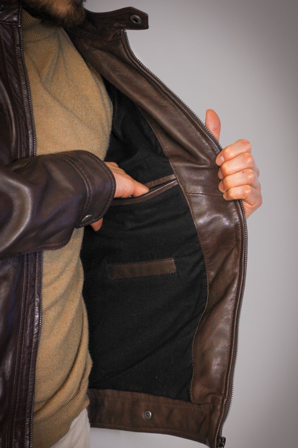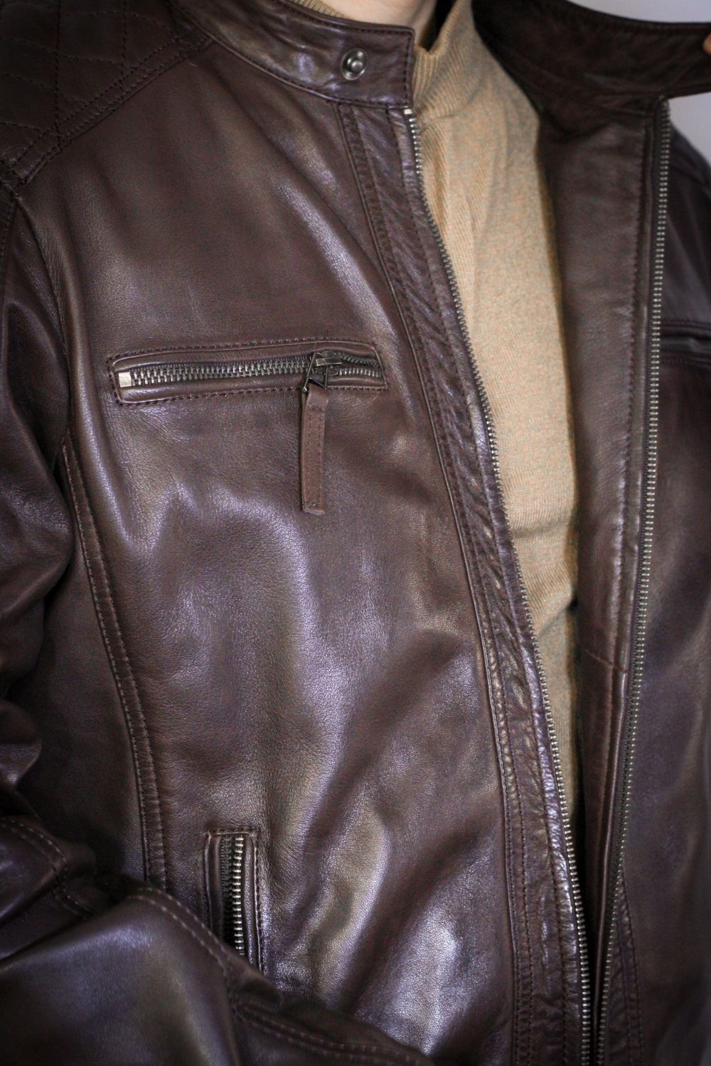 O Blusão em pele Copenhague nasce da fusão entre o clássico e o contemporâneo — uma peça criada para quem aprecia qualidade real, presença e discrição sofisticada. O acabamento em pele coffee revela profundidade cromática e nuances naturais que variam subtilmente com o movimento e a luz, um efeito típico de um couro tratado com técnicas artesanais.