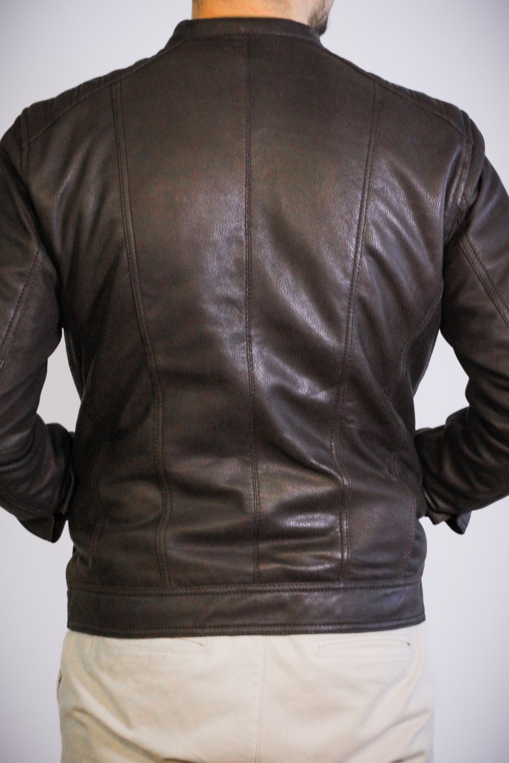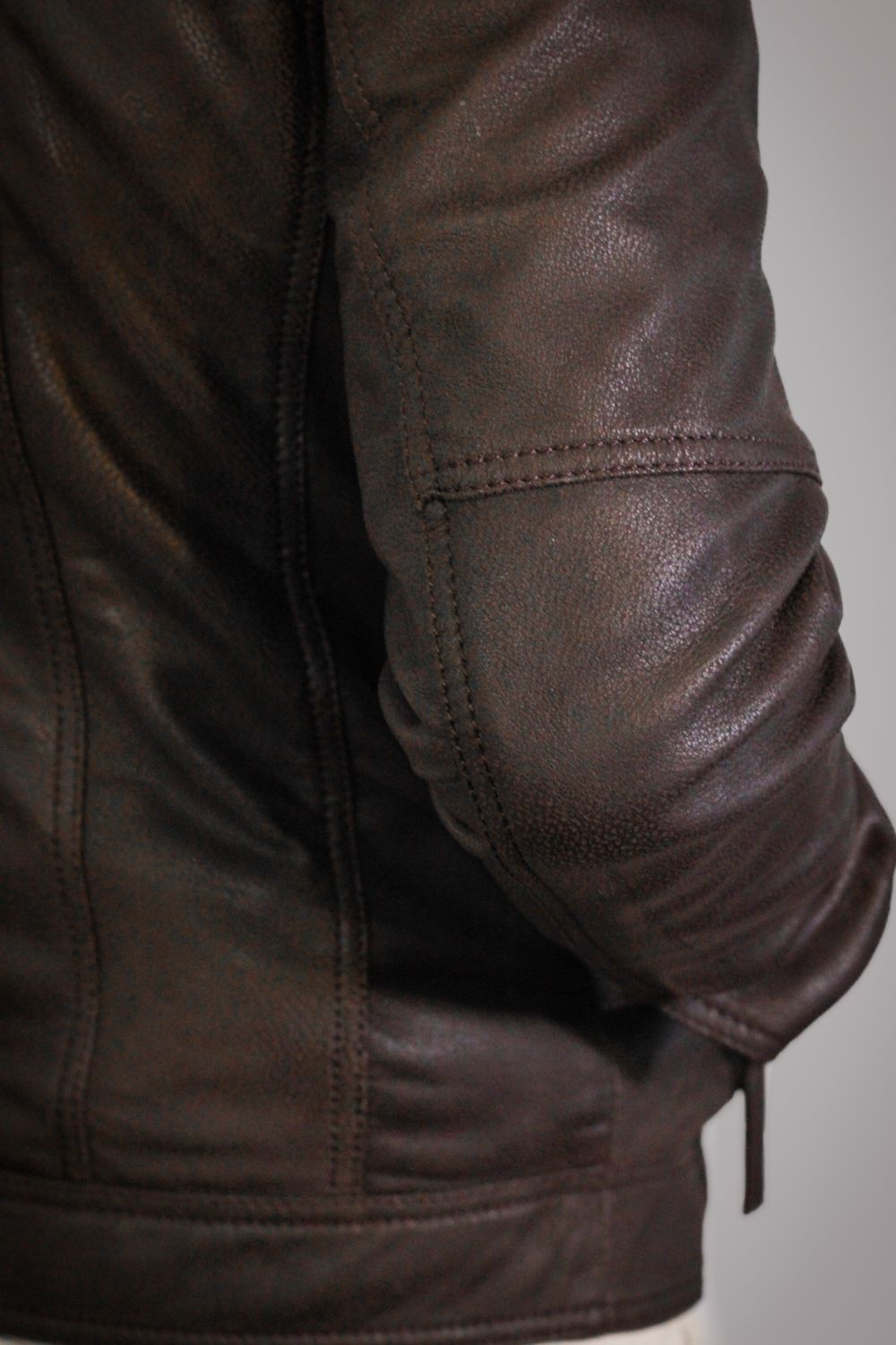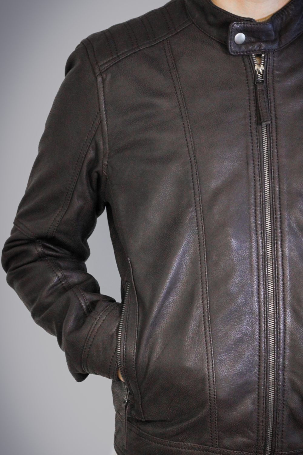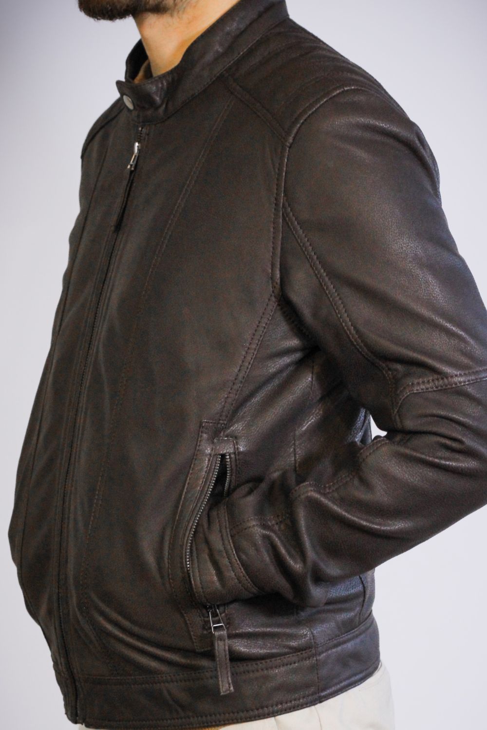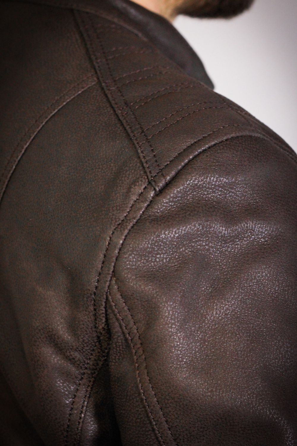 O blusão Hector diferencia-se pelo seu acabamento especial em pele de ovelha, trabalhado para alcançar uma textura suave e levemente porosa — uma sensação intermédia entre a maciez da camurça e a flexibilidade do couro tradicional. O resultado é um toque mais quente, mais natural, mais orgânico.