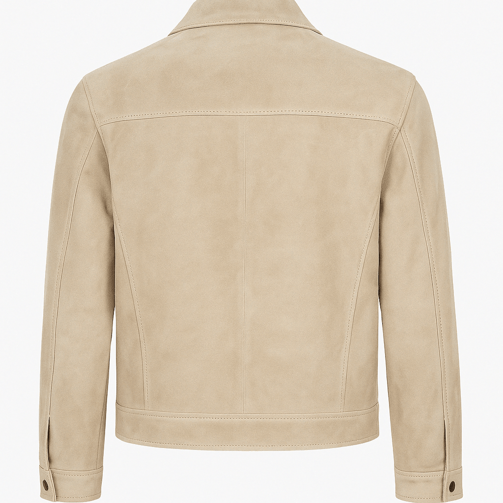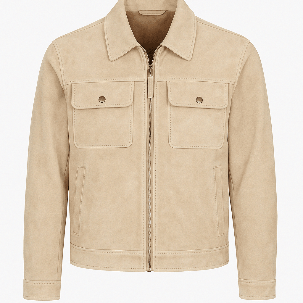 Blusão clássico em camurça de cabra genuína, cor areia, com bolso interior. Macio, elegante e ideal para todas as estações. Conforto e estilo num só.