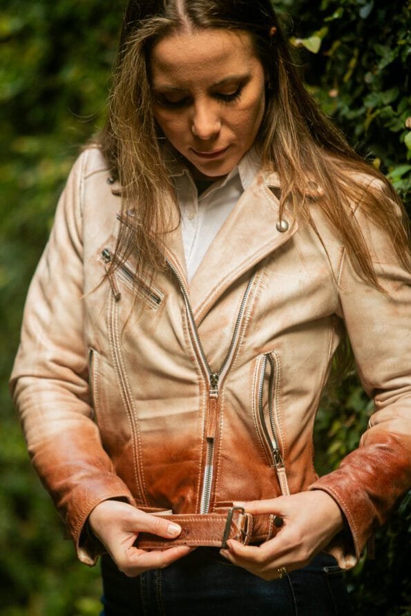 Entre na elegância com o nosso casaco em pele London para mulher, castanho e branco com efeito degradé, onde a sofisticação encontra o estilo em cada tonalidade.