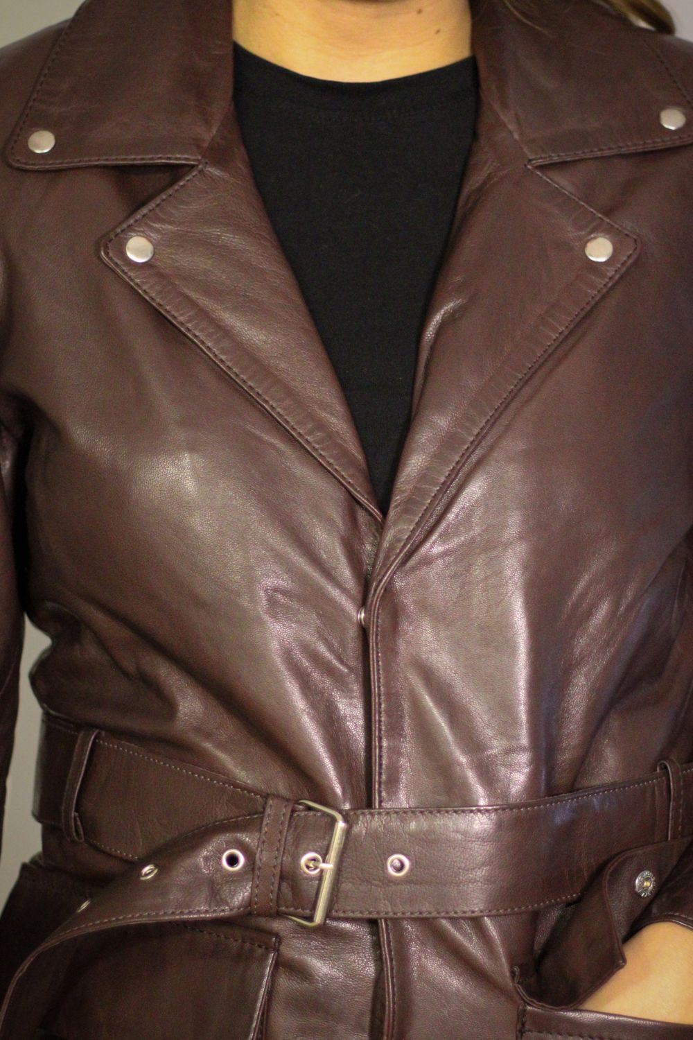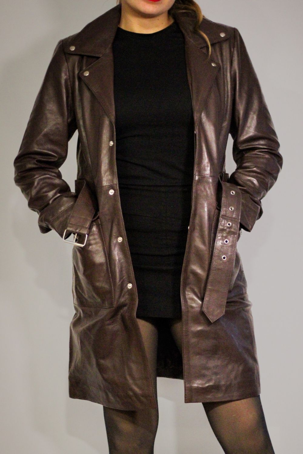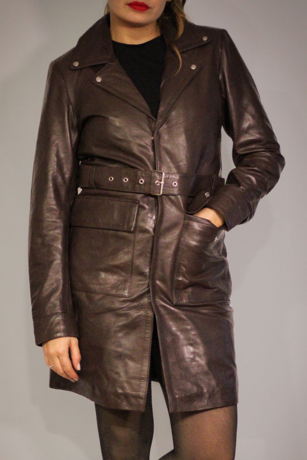 O tom castanho/coffee acrescenta profundidade e sobriedade ao visual — um neutro quente que combina com quase tudo e valoriza tanto coordenados casuais como produções mais refinadas. As solapas frontais estruturadas, o fecho com botões e o cinto ajustável tornam a peça completa, permitindo marcar a cintura ou usar aberta para um look mais descontraído.