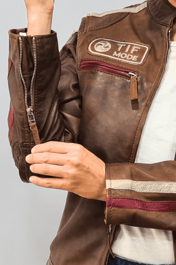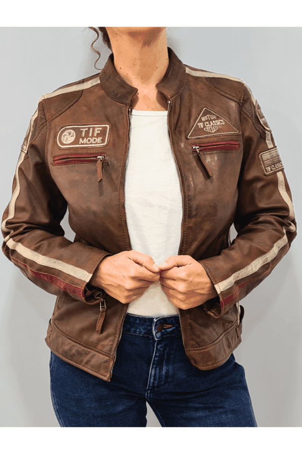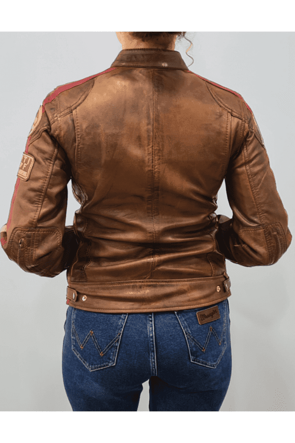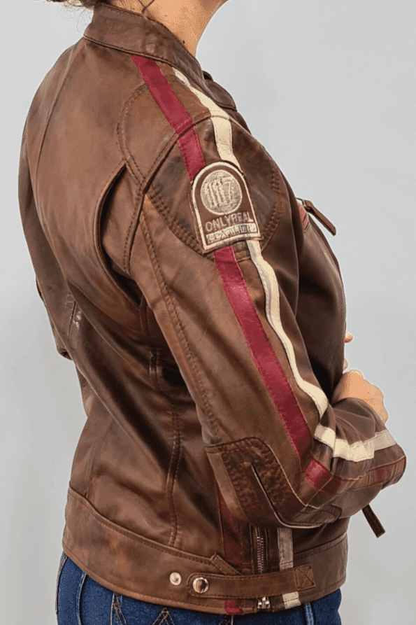 Encontre o equilíbrio perfeito entre estilo e funcionalidade com o casaco feminino Antiq Motorbiker. Este casaco de motoqueiro, feito de couro genuíno, apresenta um tom marrom clássico que nunca sai de moda. Decorado com patches e emblemas bordados, ele exala uma vibe vintage de motociclismo. As listras vermelhas e brancas nas mangas adicionam um toque de contraste, tornando-o uma peça essencial para qualquer guarda-roupa feminino.