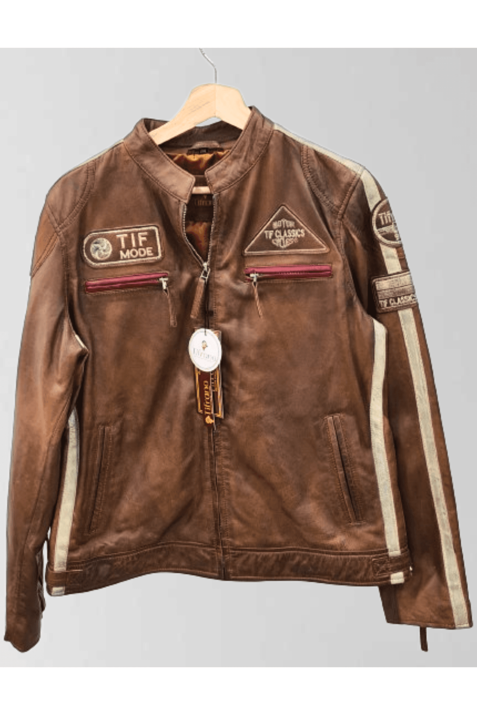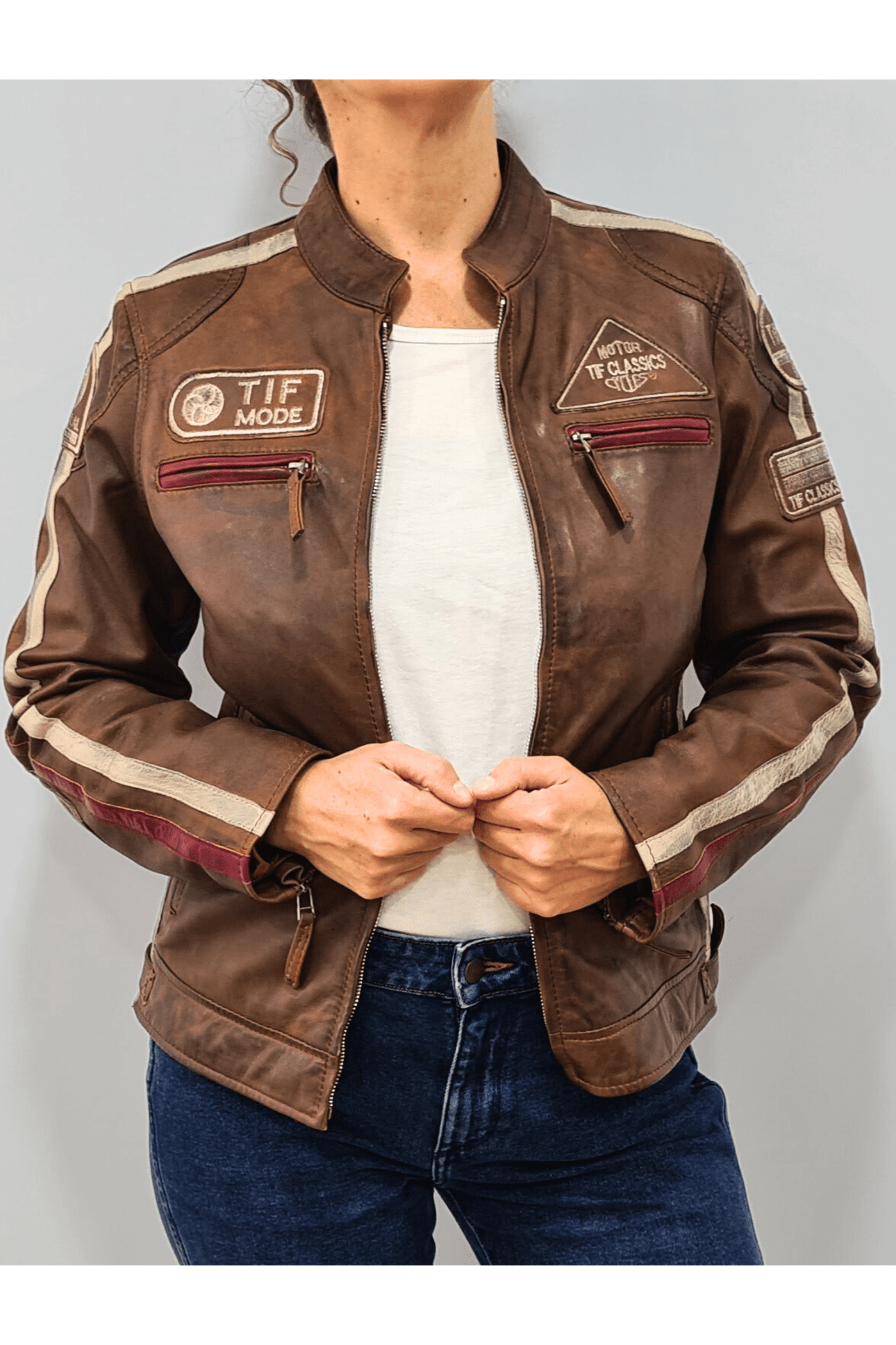 O Antiq Motorbiker da Tifrano combina um estilo vintage autêntico com um toque feminino e moderno. Feito de couro genuíno, este casaco apresenta um acabamento detalhado com patches e emblemas bordados, criando uma estética divertida e casual, perfeita para quem procura uma peça diferenciada para o dia a dia. As listras contrastantes nas mangas realçam seu design único, adicionando um toque de cor que destaca qualquer look. Seja para um passeio casual ou um evento descontraído, o Antiq Motorbiker é uma peça versátil, que mistura estilo e originalidade de forma impecável.